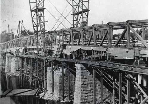 Porter completed his bridge design in 1894. The Easton Delaware Bridge Company then contracted with the Union Bridge Company of Athens, PA. to construct the structure. Union Bridge was consolidated into the American Bridge Company by financier J.P. Morgan in 1900.