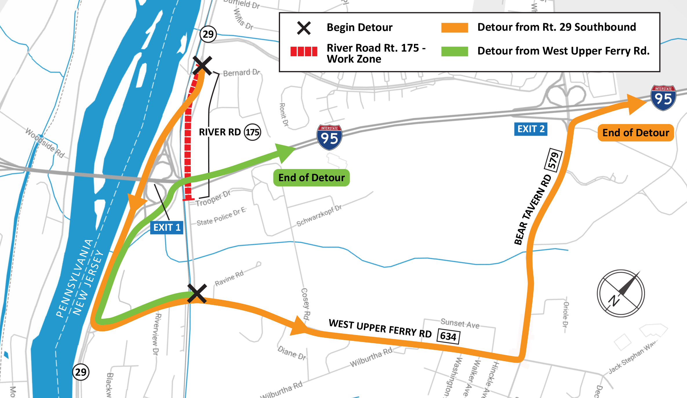 • On Route 175/River Road — OVERNIGHT closures with posted detour 10 p.m. to 6 a.m. (next morning) Monday, Apr. 30, through Thursday, May 3 and 10 p.m. Friday, May 4, to 7 a.m. Saturday, May 5.  (A detour map is available here for accessing I-295 south/I-95 north during any overnight closure of Route 175/River Road.)