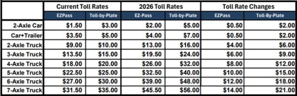 The new 2026 toll rate schedule is expected to take effect on or about January 1. A firm start date will be announced in December. The rate changes affect all vehicle categories and will be applied to all eight of the Commission’s toll bridges.